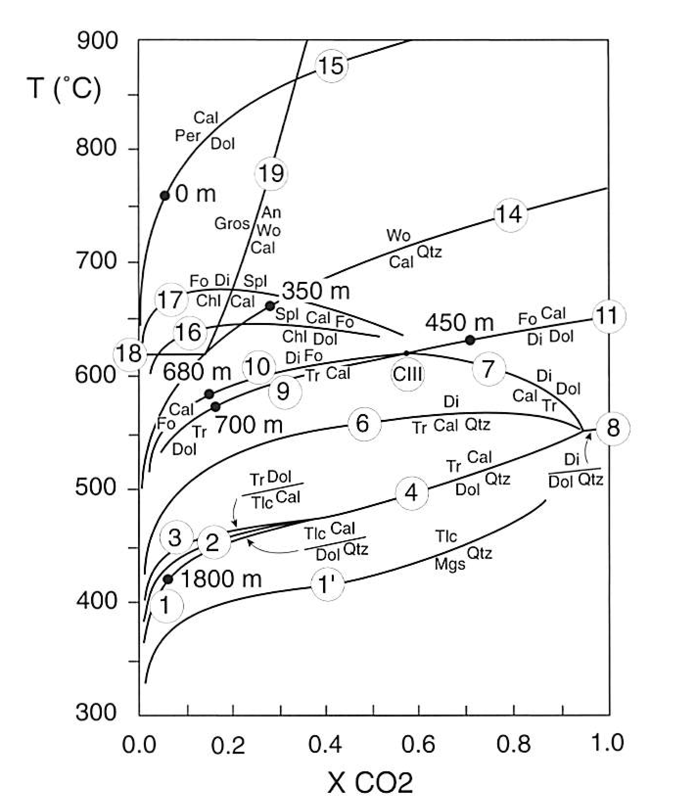 Isobaric T-XCO2, diagram (3 kbar) for selected equilibria in the chemical system CaO-MgO-SiO2-Al2O3-H2O-CO2, showing numbered reactions discussed in the text ( Pattison & Harte, 1997: modified from Masch and Heuss-Aßbichler 1991). All reactions except C18 involve H2O and/or CO2. The unlabelled reactions are: