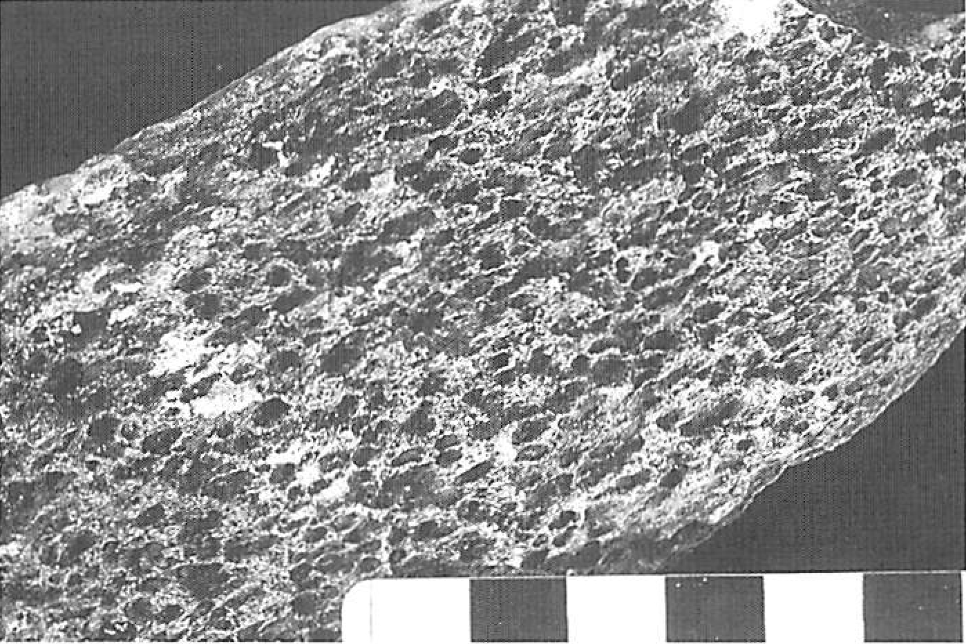 Stop 3-3. Massive, pitted pelitic hornfels from the high grade end of Zone III. Fraochaidh transect. The pits represent the sites of weathered out cordierite crystals. The matrix surrounding the pits is rich in muscovite, biotite and quartz. Scale bar in cms.