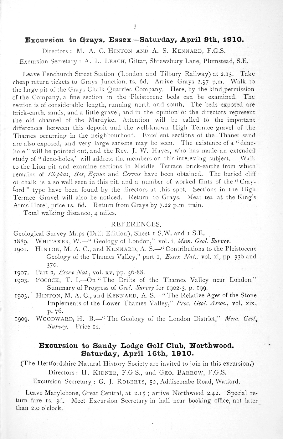 Geologists' Association Circular No. 118. p. 3. Excursion to Sandy Lodge Golf Club, Northwood. Saturday, April 16th, 1910.