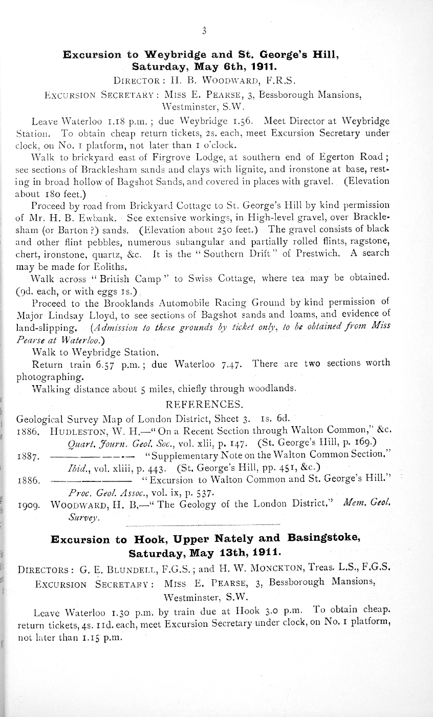 Geologists' Association Circular No. 132. p. 3. Excursion to Hook, Upper Nately and Basingstoke, Saturday, May 13th, 1911.