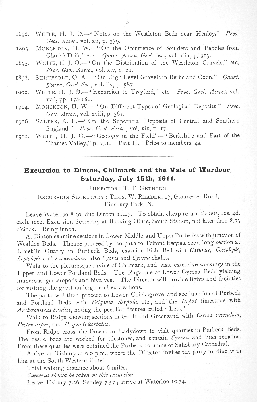 Geologists' Association Circular No. 135. p. 5. Excursion to Dinton, Chilmark and the Vale of Wardour, Saturday, July 15th, 1911.