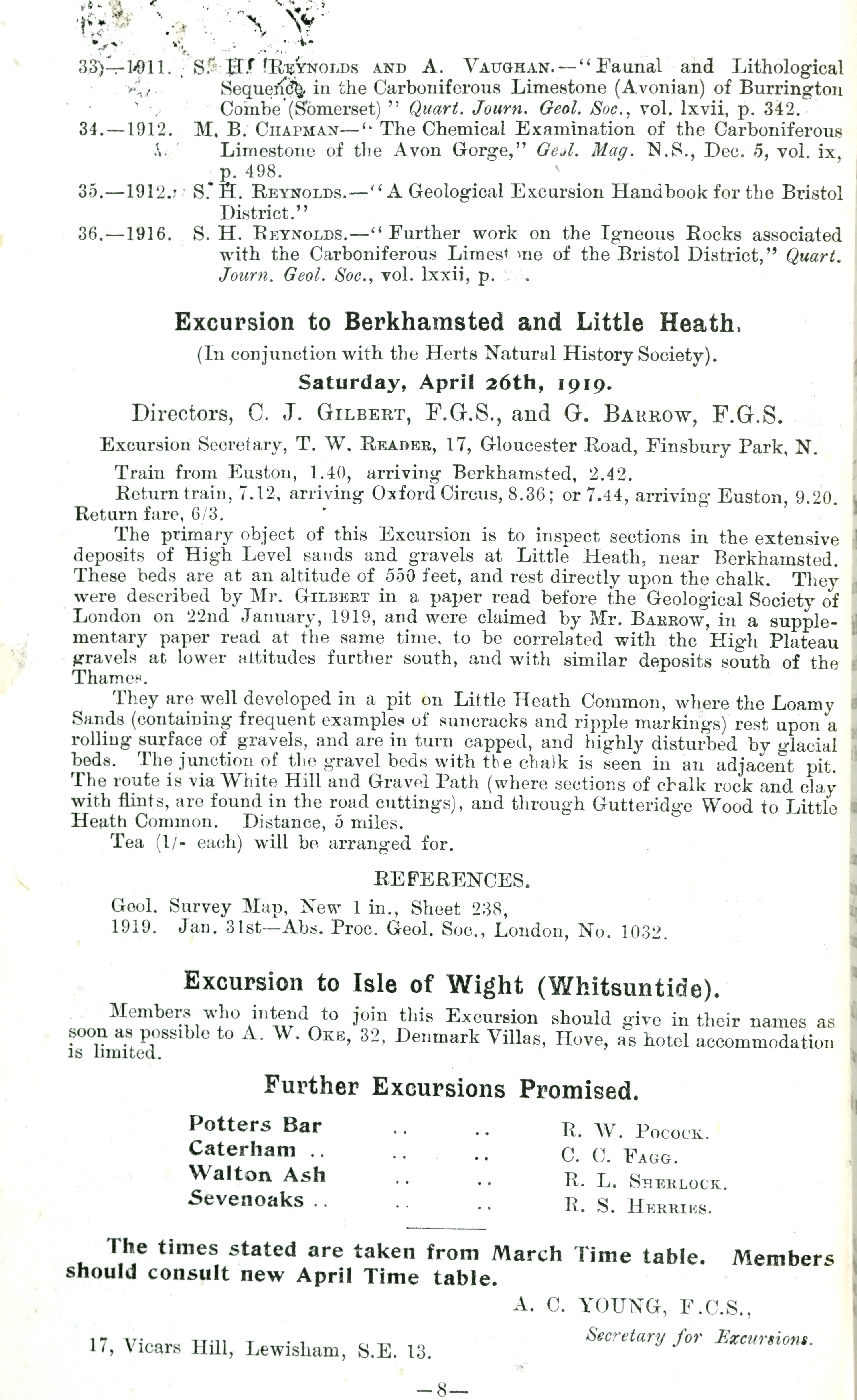 | description | English: Geologists' Association Circular No. 216. Session 1919–1920. p. 8. Excursion to Bristol District, Easter, 1919. Wednesday, April 16th, to Wednesday, April 23rd. |