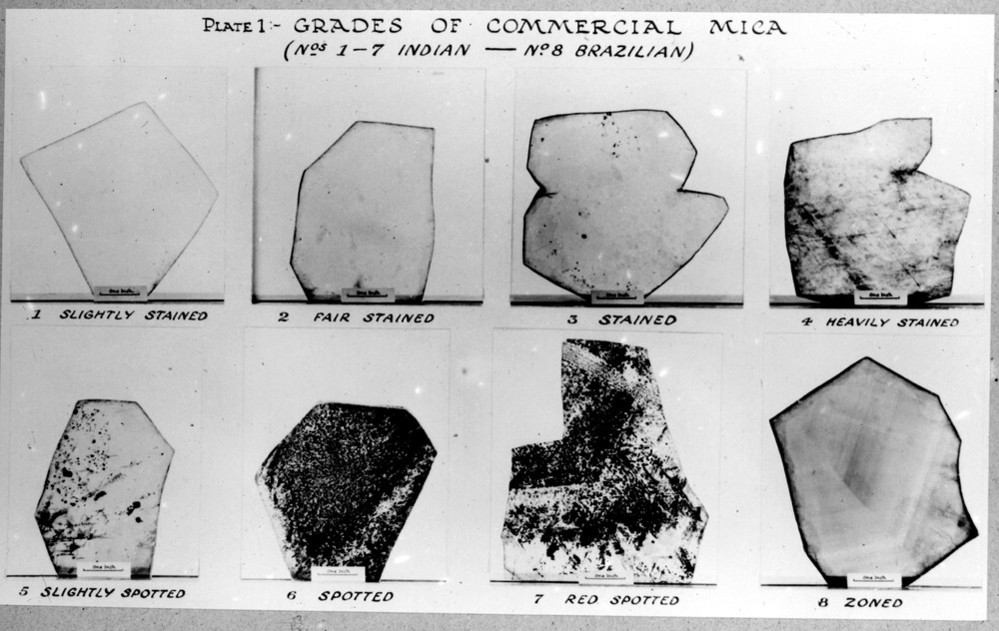 | description | English: Photograph showing grades of commercial mica. P000185. |