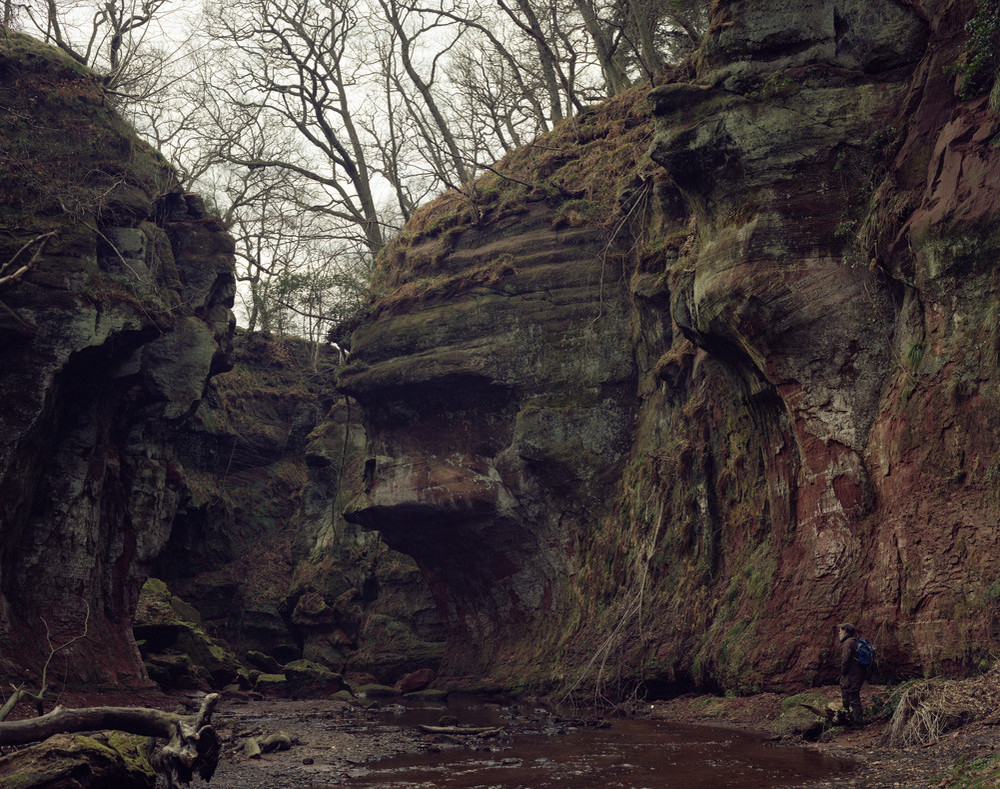 Finnich Glen, near Finnich Toll by Killearn, Stirlingshire. Gorge cut in well-laminated sandstones belonging to the Stockiemuir Sandstone Formation, Stratheden Group, Upper Devonian age. The brick-red aeolian sandstones show alternations of cross-bedded (dune facies) and parallel-bedded (interdune facies) sandstone. Intercalations up to 5 metres thick of water-laid fine-grained sandstones and siltstones with ripple-lamination are also present but represent less than a quarter of the sequence.