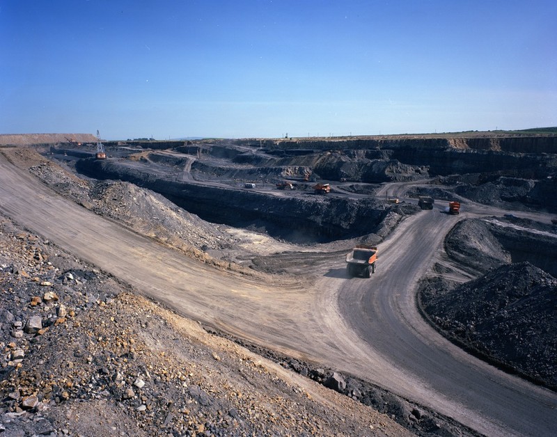 The former Blindwells Opencast Site, north-east of Tranent, East Lothian. The view shows in the centre, a crawler loader loading dump trucks. In the distance on the left is a large drag-line excavator and barely visible, a face-shovel rope excavator. General view of opencast coal working, the south face. The quarry works the Carboniferous Limestone Coal Group, from the Great Seam Coal to the Four Foot Coal. Above the coal is the overburden of glacial till.