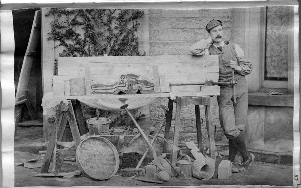 Experimental Researches in Mountain Structure. Notebook recording the results of H.M.Cadell's famous mountain building experiments. Photo of apparatus and (presumably) Cadell himself. H.M. Cadell sketch.