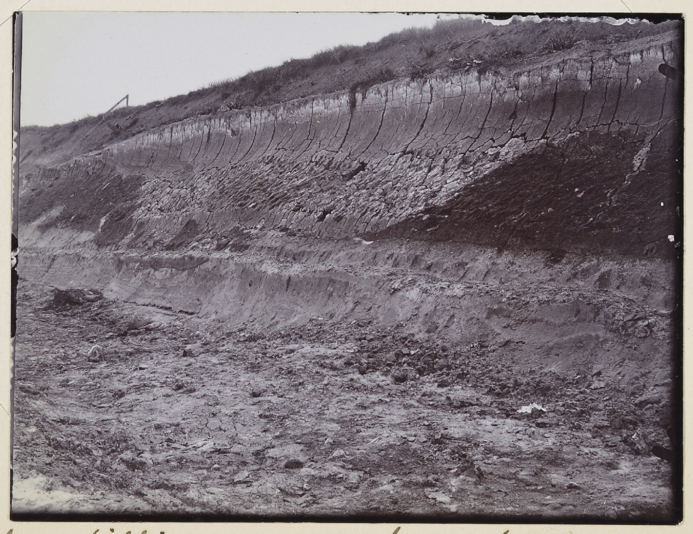 | description | English: Clay filling a washout in the peat where a cross stream has cut away the peat forming a dumb fault, as called by coal miners. Excursion to Royal Albert Docks, March 21st 1914. From: T W Reader geological photographs 1914, 1916. Geologists' Association Carreck Archive. BGS image P804655. |