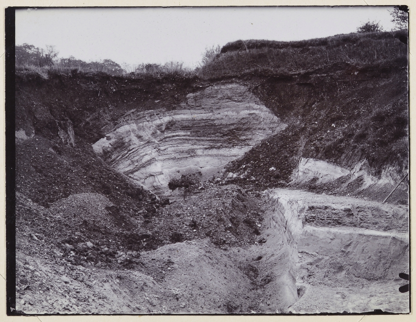 | description | English: Reading Sands, consisting of current bedded white and buff sands with strings of flint pebbles, much disturbed and bending down to fill hollow in the Chalk. Excursion to Ayot, May 9th 1914. From: T W Reader geological photographs 1914, 1916. Geologists' Association Carreck Archive. BGS image P804690. |