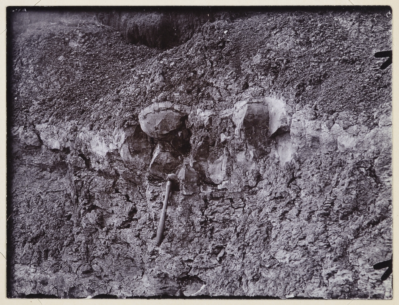 | description | English: Cone-in-cone structure round Septaria, the cracks being lined with calcite in the form of nail-headed crystals. Excursion to Soulbury, Stewkley and Wing, July 18th 1914. From: T W Reader geological photographs 1914, 1916. Geologists' Association Carreck Archive. BGS image P804765. |