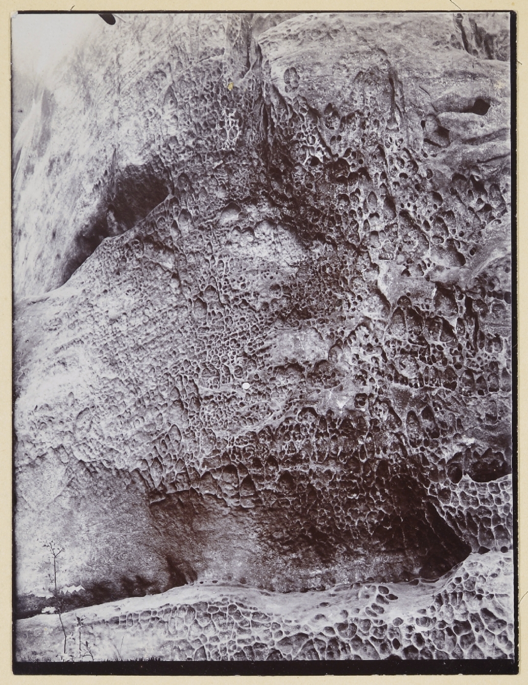 | description | English: High Rocks Lane. Characteristic patches of honeycomb weathering are well seen here. Excursion to Tunbridge Wells, May 13th 1916. It shows that the oxide of iron that cements the sand grains together and gives the rock the powers of resistance to weather is very unequally distributed, much having been abstracted by the percolation of water and other agencies more obscure. The pattern is considered to have originated by the breaking up of a damp surface into circular damp spots, thus driving the cementing material to the outside of the circle when the dry sandy interior is removed by the wind. From: T W Reader geological photographs 1914, 1916. Geologists' Association Carreck Archive. BGS image P804794. |