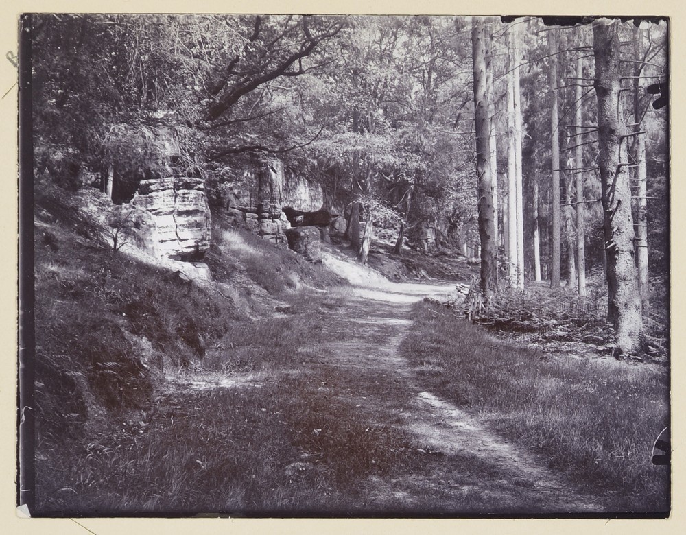 | description | English: The Tunbridge Wells Sands of the Upper Division of the Hastings Sand forms a plateau from 4 to 500 ft above sea level. Excursion to Eridge, May 22nd 1909. The uppermost 30 ft being consolidated into a massive sand rock which stands out as'cliffs' and isolated stacks. This thick bedded sandstone forms at Eridge a long section with a vertical face and many straight cut master joints.BGS Image P805333. |
