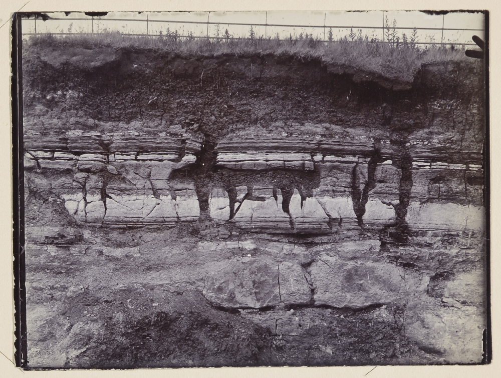 | description | English: Ladydown near Tisbury. Middle Purbeck Beds showing action of the infiltration of surface water in removing calcareous matter. Excursion to Chilmark and the Vale of Wardour, July 15th 1911. BGS image P805457. |