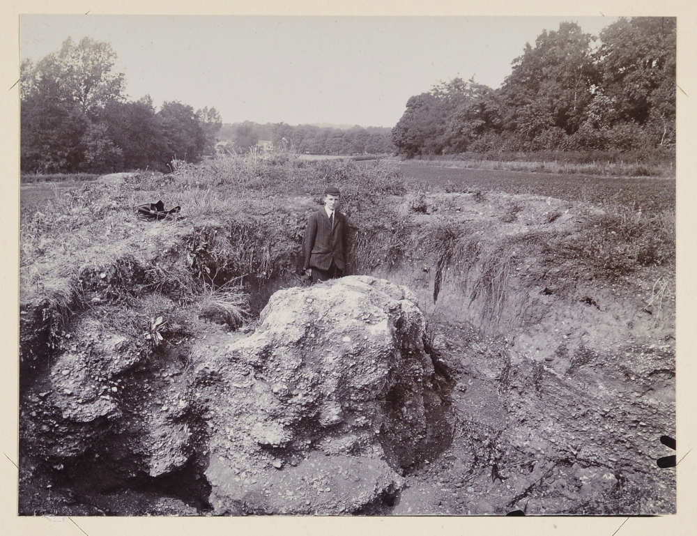 | description | English: Calcrete boulder about midway between Wenden and Saffron Walden. Excursion to Audley End and Saffron Walden, July 22nd 1911. BGS image P805461. |