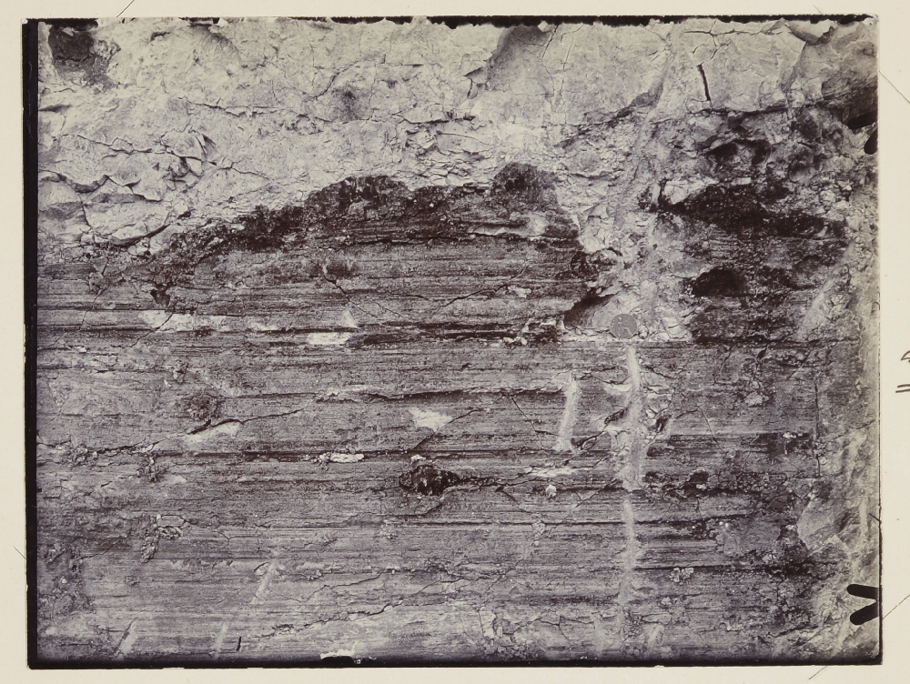 | description | English: Slickensided Chalk in a pit a little west of Nonsuch Farm, Ewell. Excursion to Ewell, July 6th 1912. In this pit was seen a fine example of horizontal slickensides, it covered a surface of many square yards along the prominent joint planes which run from SE to NW, the whole surface being scored by grooves owing to horizontal movement. Added note: Halfpenny = 1 inch. BGS image P805540. |