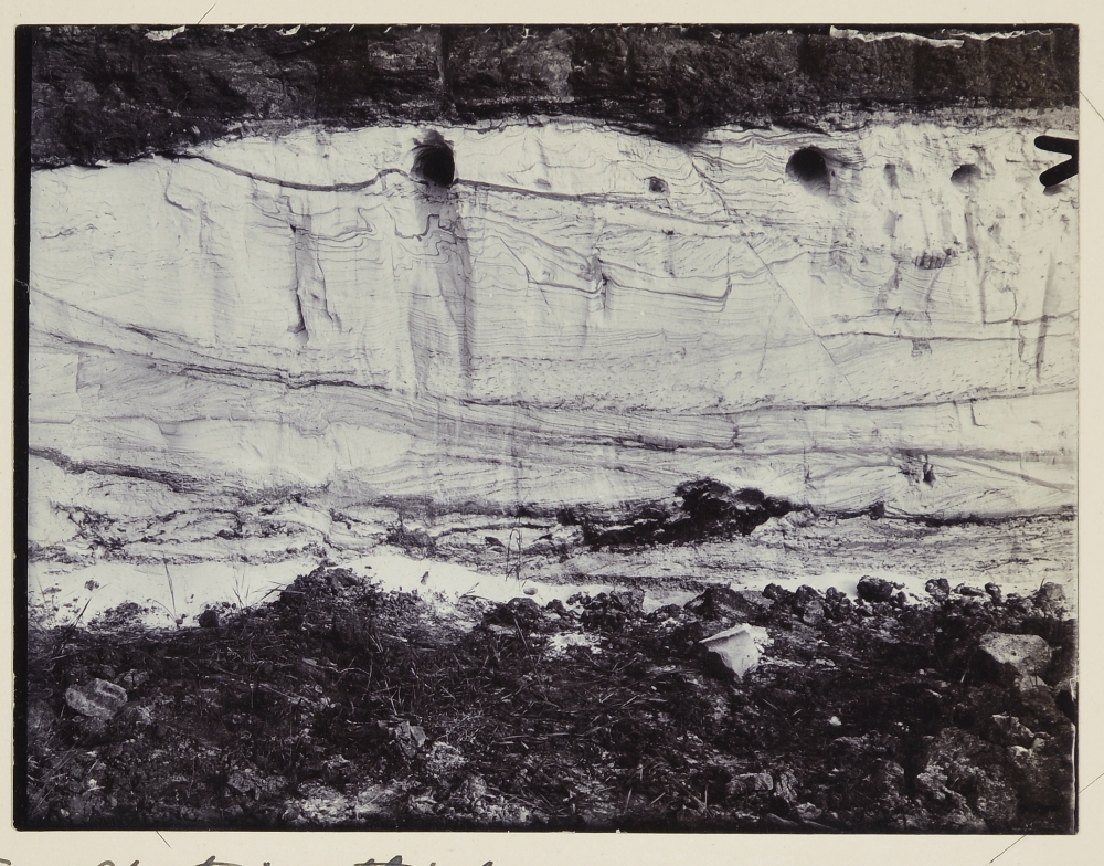 | description | English: Aptian Sands at Windmill Pit, Stone (Lower Greensand). Excursion to Aylesbury, Hartwell and Stone, July 27th 1912. In this pit is seen a bed of white sand 9 feet in thickness and beautifully false bedded with bands of pebbles, carbonaceous sands and concretions. Above them with an apparent unconformity due to contemporaneous erosion is a bed of clay 5 to 6 feet thick with ironstone bands near the base. These sands have been bleached by the action of organic acids arising from the decomposition of vegetable matter which have run out the iron and other soluble substances leaving a nearly pure silica suitable for glassmaking. BGS image P805590. |