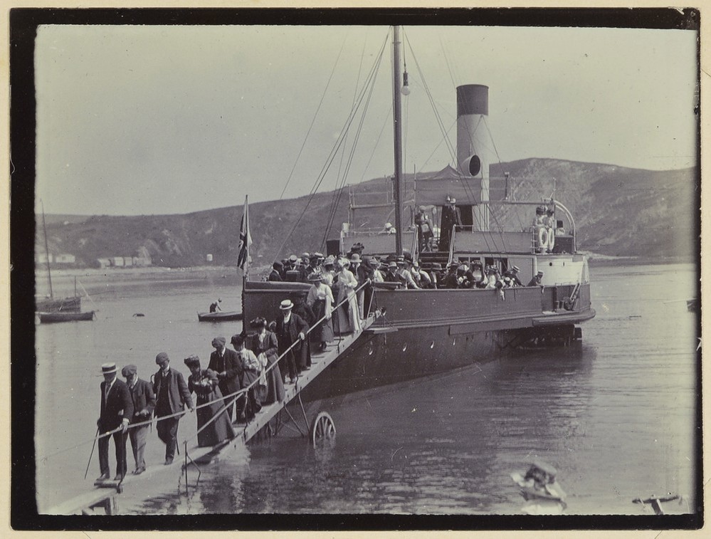 [Lulworth Cove.]. [Swanage Excursion, May 14th 1910].Description:The Cove at Lulworth has been hollowed out in the cliffs by the force of the waves. It is nearly circular in shape being 1380 feet across at 21 feet deep at low water with a break in the side by way of entrance from the sea.:From the Geologists' Association Carreck Archive. The Reader Geological Photographs Long Excursions 1910. BGS image P805970.