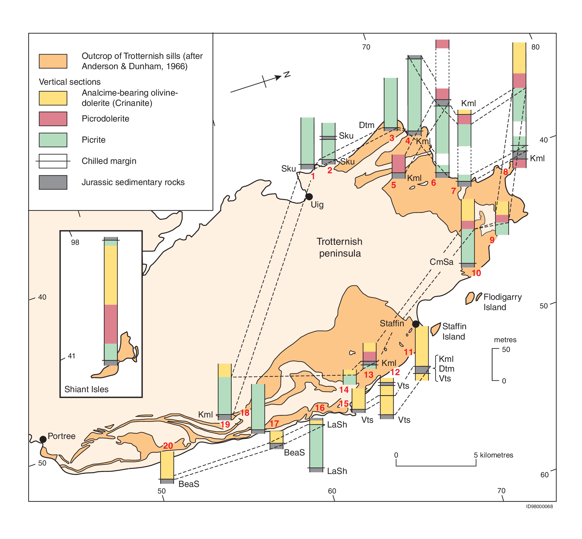 The Little Minch Sill-complex crops out on the Trotternish peninsula of north Skye, and it forms almost all of the Shiant Isles, with more restricted outcrops on the Waternish and Duirinish peninsulas (north Skye) and the west coast of Raasay (P914135). Significant submarine outcrops occur within the Little Minch, between Skye and Harris. The country rocks are typically Jurassic sandstones and mudstones. Studies by Drever and Johnston (1965) and Anderson and Dunham (1966) were concerned predominantly with the field relationships and petrography of the sills. These investigations identified their alkaline nature, ranging in composition from olivine-rich picrite and picrodolerite, through to more-evolved analcime-bearing olivine-dolerite (‘crinanite’). Simkin (1967) developed a model involving flow differentiation and gravity settling or flotation processes to explain the mineralogical variation and layering within certain of the sills. More recently, the sills on the Shiant Isles and Skye have been investigated in order to understand their mode of emplacement and petrogenesis (Gibson, 1990; Gibson and Jones, 1991; Foland et al., 2000; Henderson et al., 2000 and references therein).