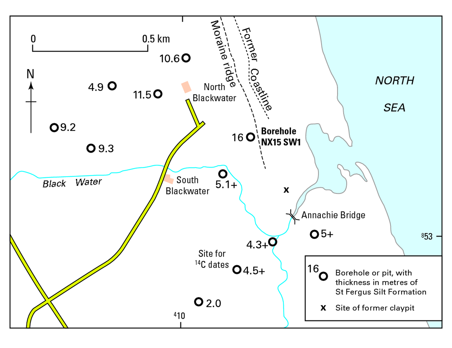 The position of the St Fergus Silt Formation within the local stratigraphy is difficult to ascertain because it rests on a variety of older deposits. The records of commercial boreholes associated with the St Fergus Gas Terminal suggest that the formation overlies an undulating surface of greyish brown or green clayey diamicton. Although the clasts in these diamictons are mainly of local igneous and metamorphic lithologies, in at least one borehole (NK 095 545) the weakly calcareous, very dark greyish brown (2.5 Y 3/2) sandy silty clay matrix contains a rich dinoflagellate flora. Possible Late Jurassic to Early Cretaceous cysts were obtained together with some Quaternary forms (information from R Harland, 1980). A provenance either from the north-west in the Moray Firth, or from the north-east to east in the western North Sea is indicated. In a borehole near North Blackwater (NK 100 537), the St Fergus Silt Formation is reported to rest on reddish brown diamicton (presumably Logie-Buchan Drift Group) that in turn overlies greyish green till. In another borehole immediately east of Annachie, red till is reported to overlie grey till, but to be capped by dark grey till (McMillan and Aitken, 1981). Both records suggest that Logie-Buchan Drift Group deposits could be locally present below the St Fergus Silt Formation. On the south-eastern side of the gas terminal, probably close to the former North Blackwater Farm (NK 100 537), the St Fergus Silt Formation is reported to rest on dark shelly till with chalk erratics (Hall and Jarvis 1989). Similar dark diamicton with chalk fragments and numerous erratics of granite, probably derived from the local, but unexposed, St Fergus Granite, has been seen in spoil heaps towards the sea. Wilson (1886) recorded a dark coloured till containing supposed Old Red Sandstone flagstone and marl erratics in the St Fergus area and an erratic of ooidal sandstone at Pittenheath (NK 100 550).