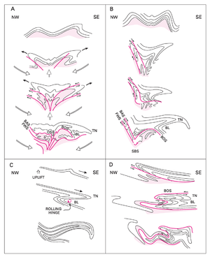 It is possible that the SE-facing folds, such as the Tay Nappe, originated as high level ’rootless‘ gravity nappes triggered by the thrusting and consequent crustal thickening. However, in many current models the distinction between these and the NW-facing folds is of lesser significance. Although they may well have originated as primary structures, their current facing direction is probably a result of backward gravitational collapse or of subsequent deformational events.