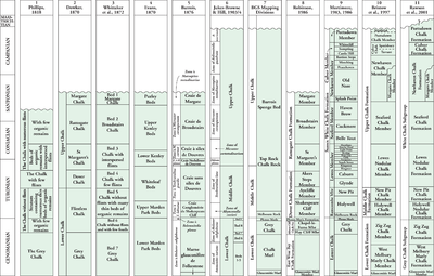 The following definitions cover the New Chalk Stratigraphy as promulgated in Rawson, Allen and Gale 2001 following the joint stratigraphical framework meeting held at BGS Keyworth in November 1999. As such they should be taken as the standard nomenclature in all future BGS publications in the Southern (including where possible the Transitional Province) Province of England.