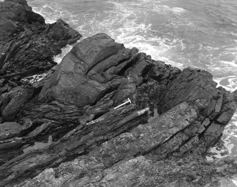 Linkim Shore, Yellow Craig. Looking SE. Tight folding in greywackes of 'Coldingham Beds' (Silurian). The axial plane and the bedding dip at c. 50 degrees to north-east: the fold axes plunge northwards at about 40 degrees.