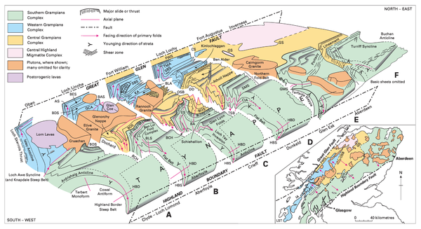 Current structural interpretations of the Grampian Caledonides are still based upon those proposed by E B Bailey, which drew on the results of the primary mapping by the Geological Survey. In a series of papers, from 1910 to 1938, Bailey demonstrated that the rocks of the South-west and Southern Highlands are disposed in large recumbent folds. The lower limbs of many of these folds are partly replaced by low-angled, extensional faults, termed ‘slides’, with postulated movements of several kilometres. In 1922 Bailey produced a comprehensive synthesis in which major slides were perceived as fundamental tectonic dislocations separating nappe complexes, each complex having its own stratigraphical succession and structural style. Initially three such nappe complexes were recognised and named, in ascending structural order, the Ballappel Foundation (from the type areas of Ballachulish, Appin and Loch Eilde), the Iltay Nappe (from Islay and Loch Tay), and the Loch Awe Nappe, but these were subsequently reduced to two when Bailey (in Allison, 1941) accepted the stratigraphical correlations of other investigators which removed the need to invoke a separate Loch Awe Nappe.