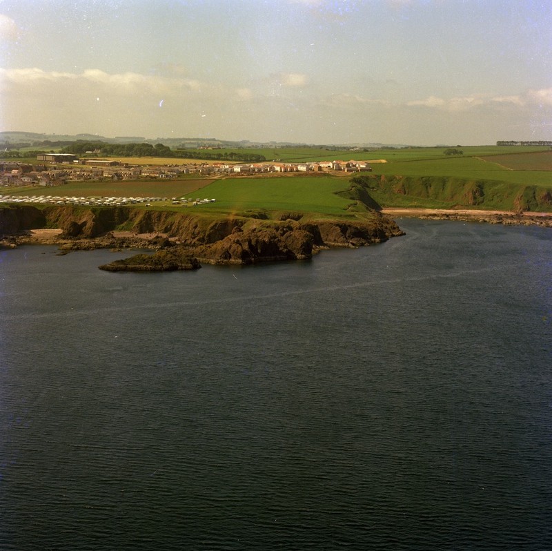 Oblique aerial view of Hairy Ness, Eyemouth taken from the north-east. Berwickshire. The headland is made up of andesitic and basaltic lavas of Lower Old Red Sandstone age with some beds of coarse agglomerate. The less prominent rocks of Killiedraught Bay on the right, are a mixed volcanic assemblage probably filling an old volcanic vent. The outskirts of Eyemouth can be seen beyond the headland. P000809