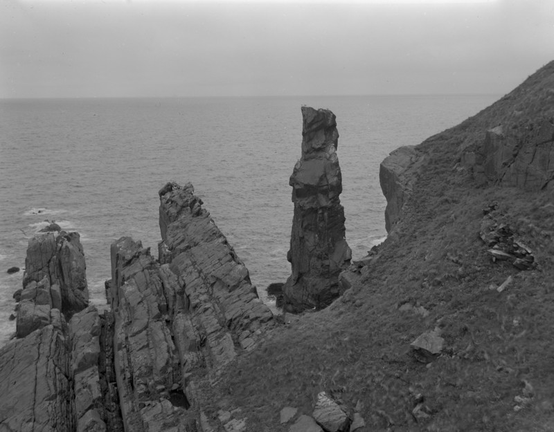Souter, Dowlaw. A stack c. 15 m. high in a band of Silurian greywacke c.18 ft. thick. The vertical beds young towards the south-east, right in photograph. P218932