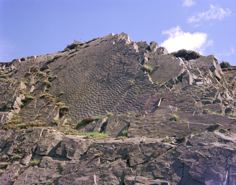 Harly Darlies, Dowlaw. Ripple marks on Silurian greywacke. The beds dip at 55 degrees to north-west. The marks appear to have been formed by currents flowing from bottom left to top right. Sub-parallel development on several bedding-planes. P005884