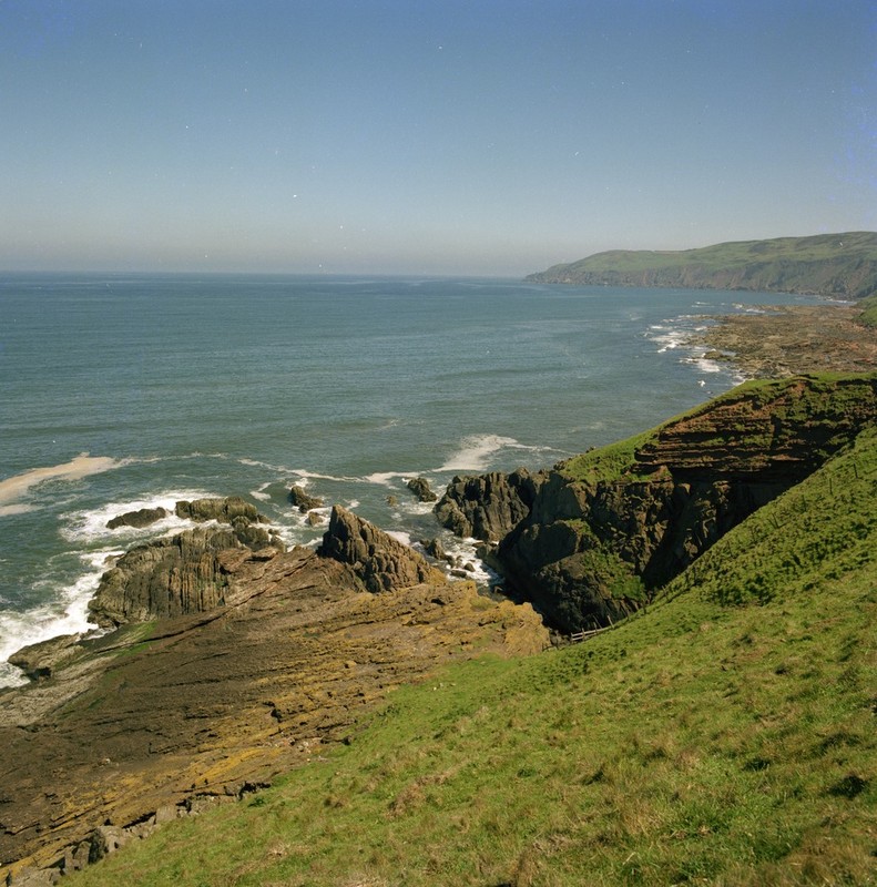 Siccar Point, eastward view. Berwickshire. Unconformity between Upper Old Red Sandstone and the underlying Silurian (Llandovery) age rocks. Dark red sandstones and breccias of the Upper Old Red Sandstone age dip at low angles to the north and rest unconformably on an uneven surface of vertical greywackes and siltstones of Silurian (Llandovery) age. The red sandstones form the shore in the middle distance; the cliffs beyond, between Fast Castle and St. Abb's Head, are formed of steeply-dipping folded greywackes.