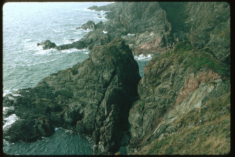 Burrow Head. Looking N. Red mudstones in Carghidown Formation. Unusually thick red mudstone beds in steeply-dipping, locally disrupted greywackes of the Carghidown Formation, Hawick Group.