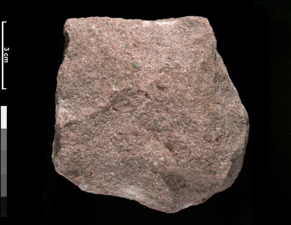 Rock specimen of sandstone from Craigmillar Quarry, Edinburgh, Lothian Region, Scotland. The sample is a medium to coarse-grained hard crystalline sandstone with a pale pink colour caused by the presence of clear quartz grains within an iron oxide matrix cement. This specimen is of Carboniferous age. British Geological Survey Petrology Collection sample number MC1279. The sample has the original label of the Geological Survey of Scotland, plus the number of the geologist who collected it (XT5), and the BGS collection number (MC1279). Craigmillar Quarry was one of the most important providers of sandstone to the city of Edinburgh. It was used mainly for rubble walling in combination with a higher quality stone which was used for the dressed stonework on building fronts. Size of specimen: 8x7x5 cm. Munsell colour code and colour 5RP7/2, pale purple pink. P519459