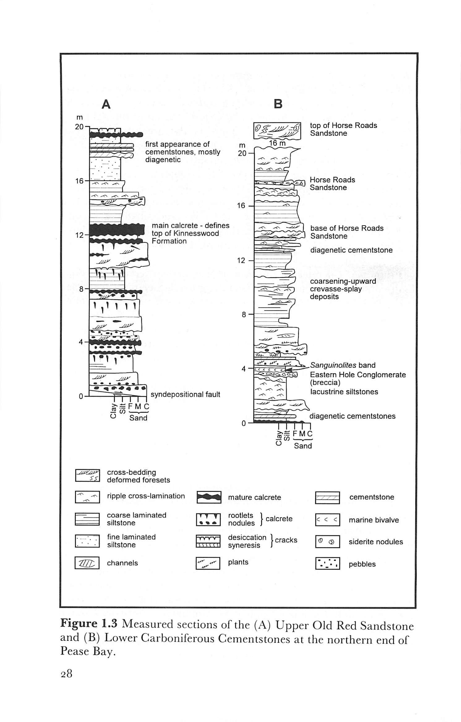 | description | English: Figure 1.3 Measured sections of the (A) Upper Old Red Sandstone and (B) Lower Carboniferous Cementstones at the northern end of Pease Bay.