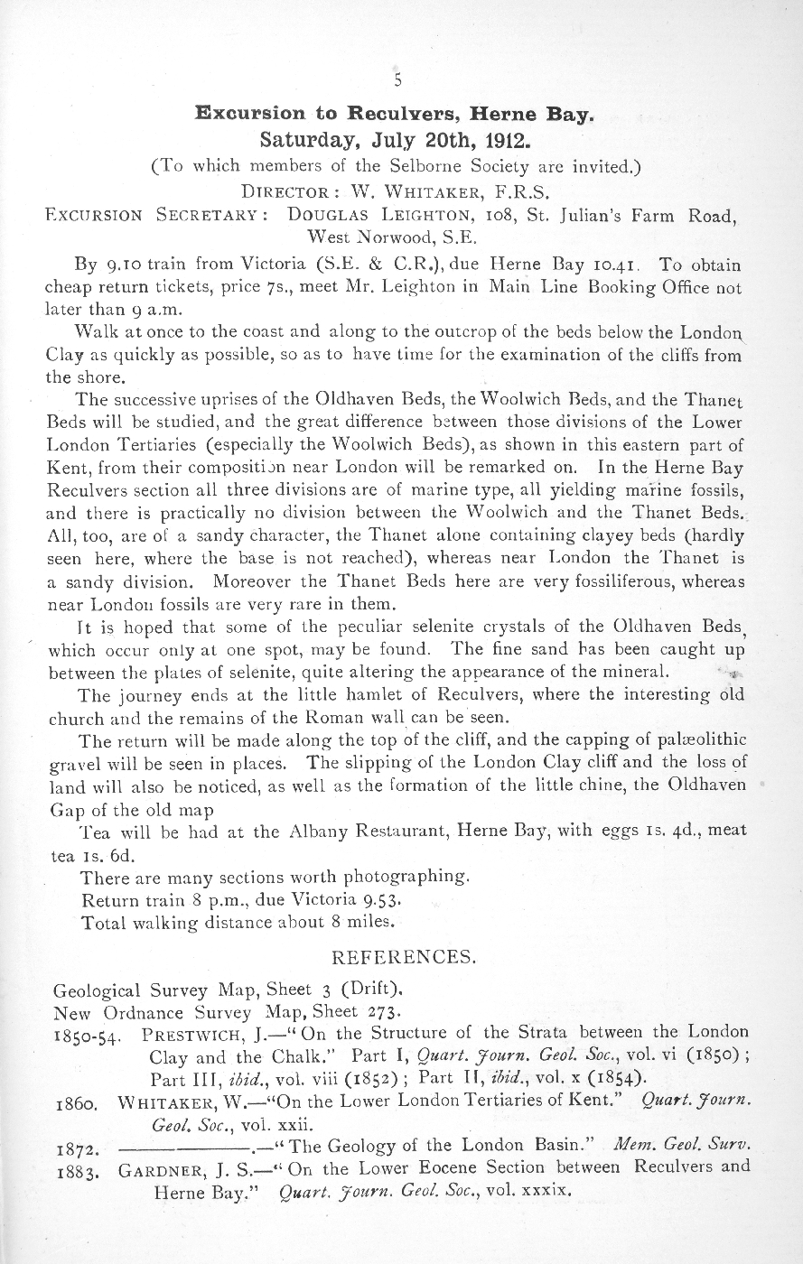 Geologists' Association Circular No. 146. p. 5. Excursion to Reculvers, Herne Bay. Saturday, July 20th, 1912.