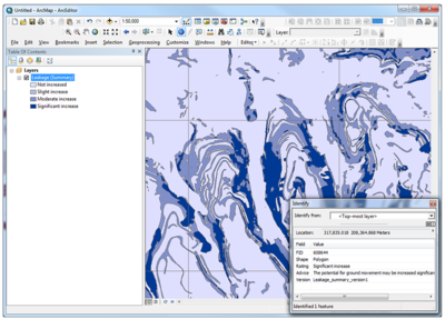 The Pipe Leakage Impacts map (summary) comprises one GIS layer called ‘Leakage_summary’. It provides information on whether leaking assets could increase the potential for ground instability (Figure 2). This summary map provides an overview of the extent to which leakage may increase ground instability, but it does not provide information on which hazards may be impacted.