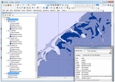 The Pipe Leakage Impacts map (detailed) comprises one GIS layer called ‘Leakage’. It provides information on whether leaking assets could increase the potential for ground instability (Figure 1). It includes a summary map providing an overview of the extent to which leakage may increase ground instability. It also includes a further six sub-layers providing information about which hazards might be impacted.